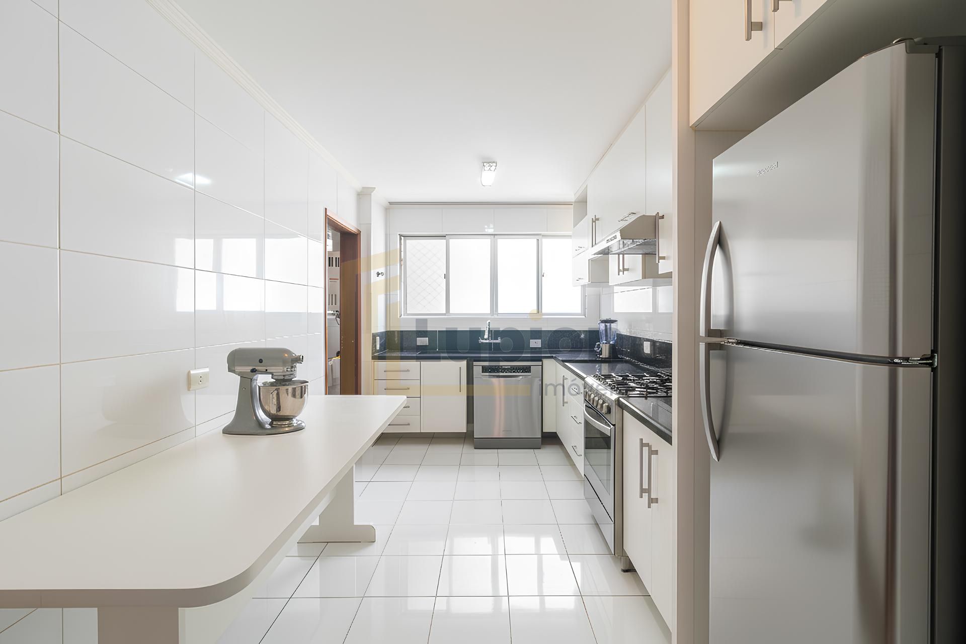 Cozinha planejada, mobiliada, com mesa e despensa