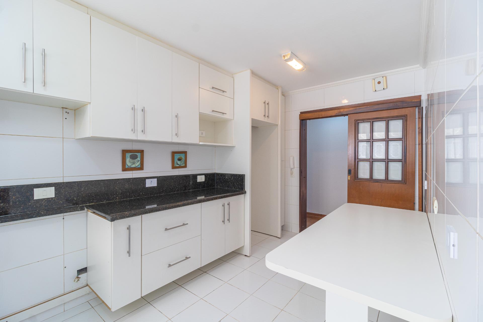 Cozinha planejada, mobiliada, espaçosa e funcional, com mesa e despensa