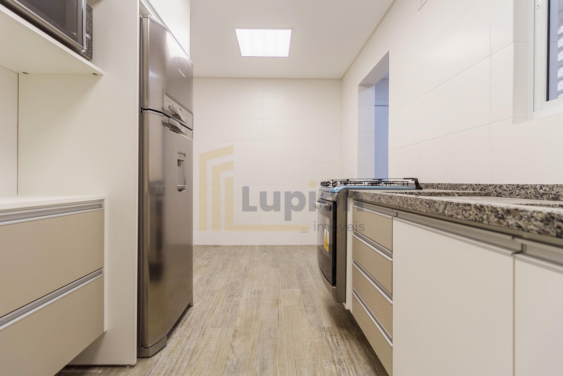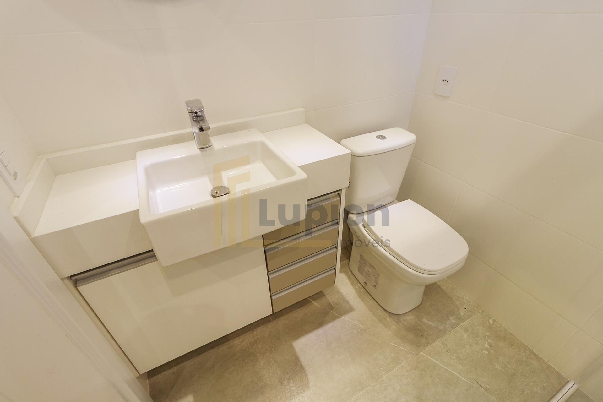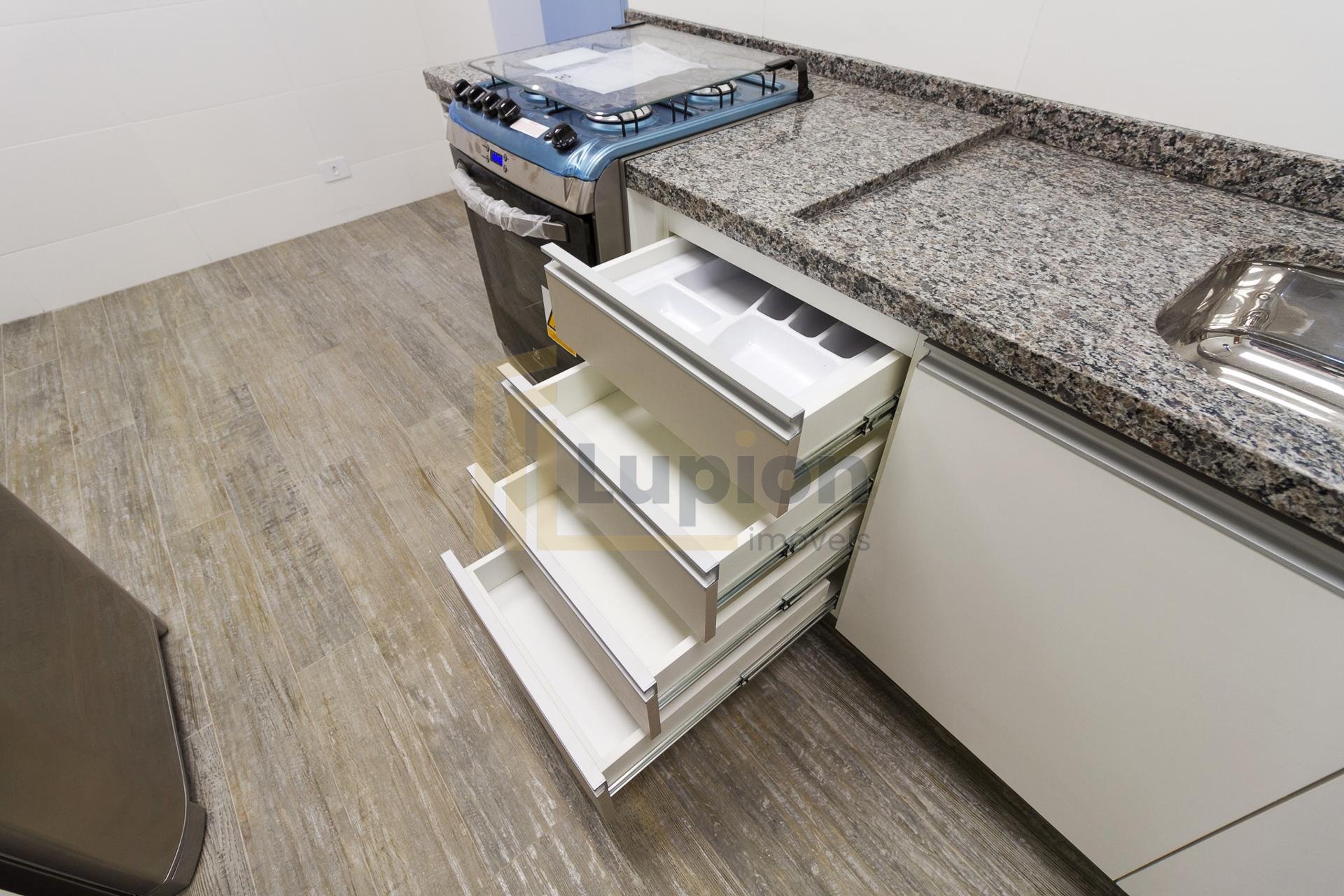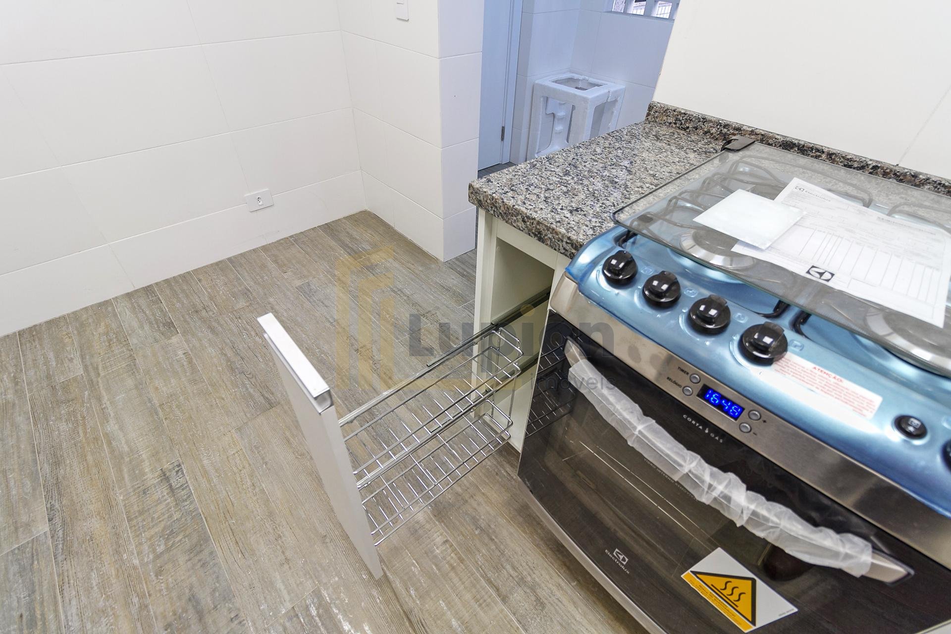 Com 101,42 m² de área privativa, o imóvel é bem ventilado e iluminado. Possui três quartos, sendo uma suíte com armários planejados, além de sala integrada, lavabo e cozinha equipada com armários.