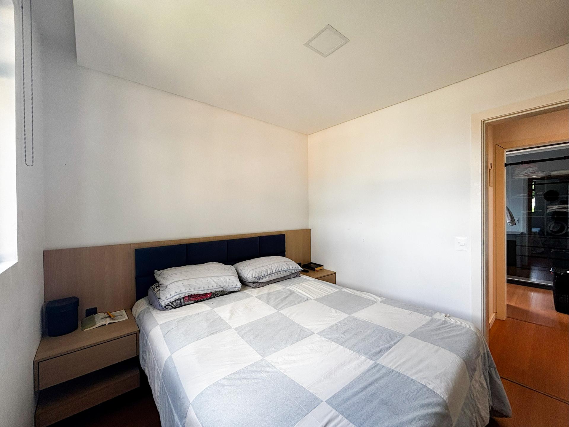 Quarto Principal com cabeceira planejada para cama e painel para televisão.