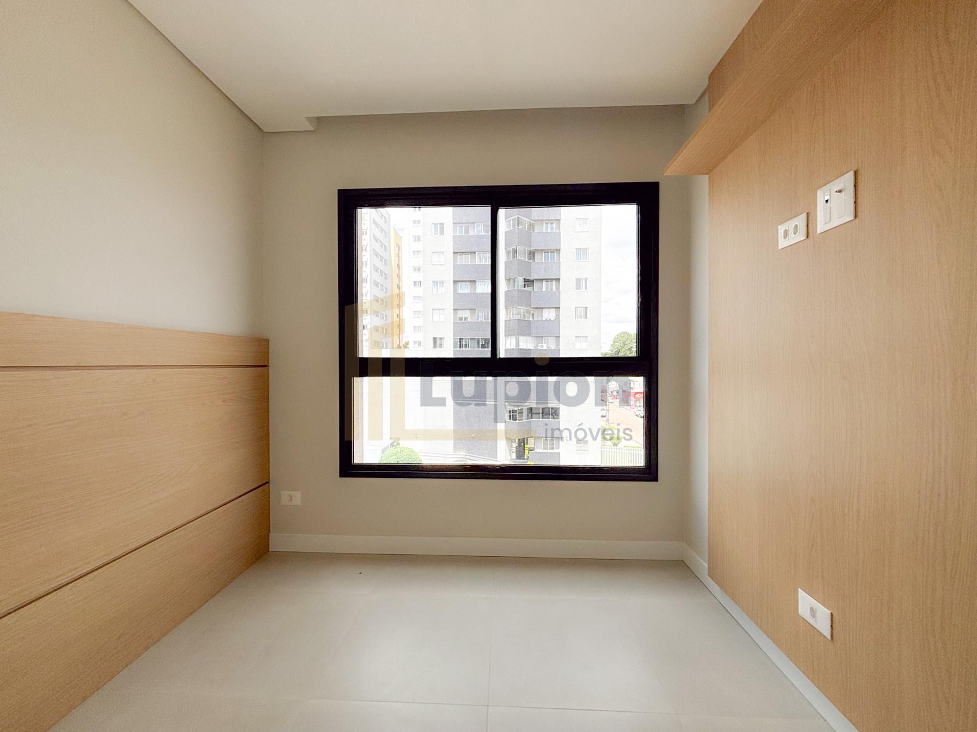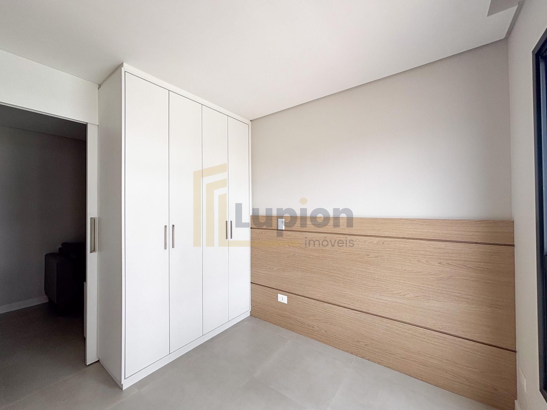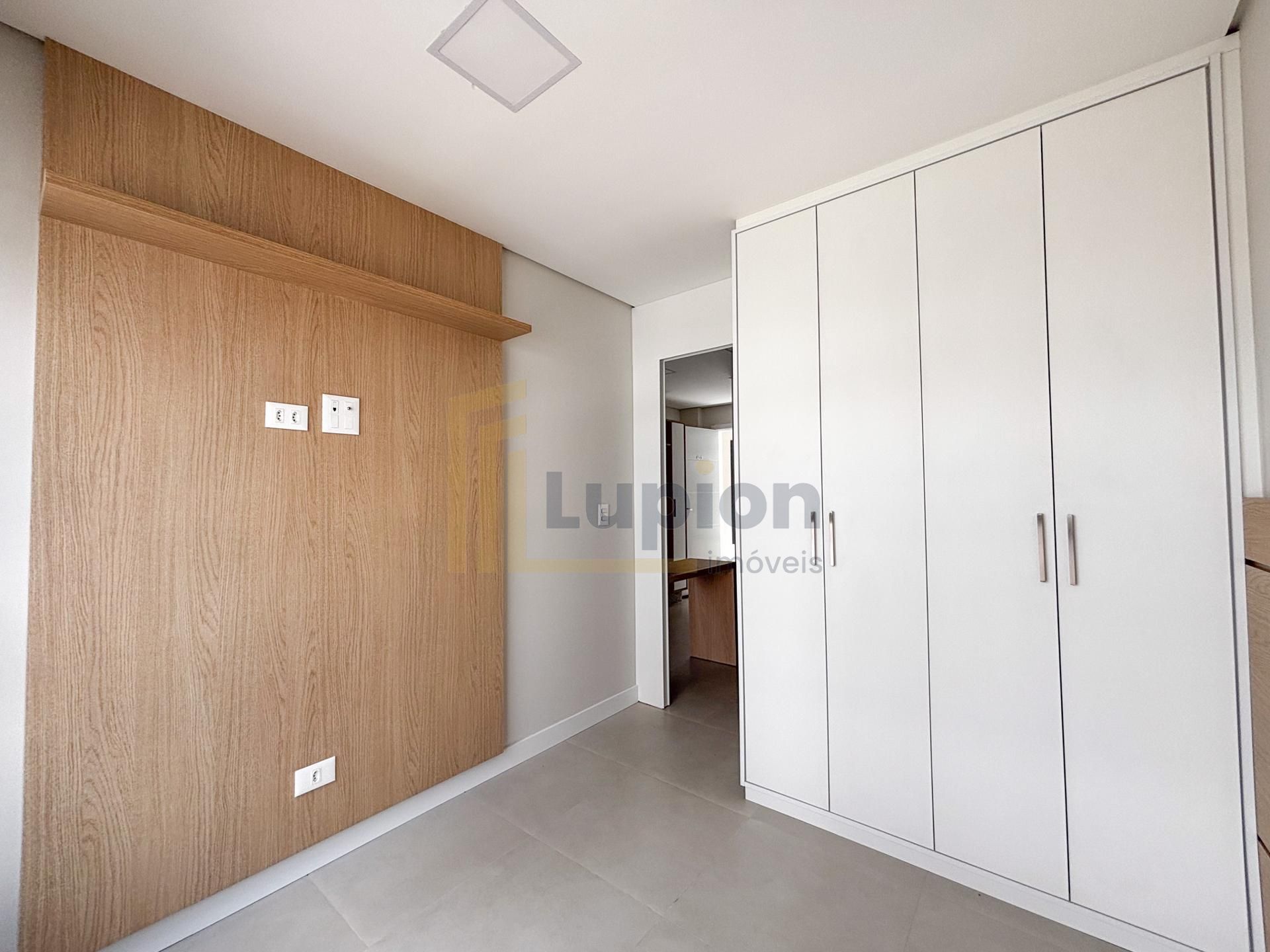 Quarto separado por porta de correr, com painel de TV, cabeceira em madeira nobre e amplo armário de 4 portas;