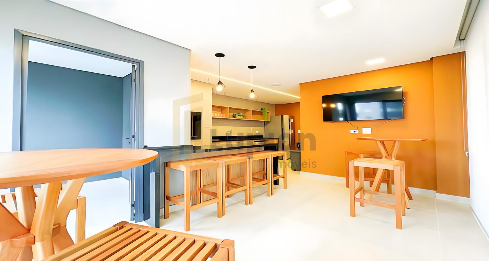 Sala integrada com painel de TV, sofá, armário e bancada;