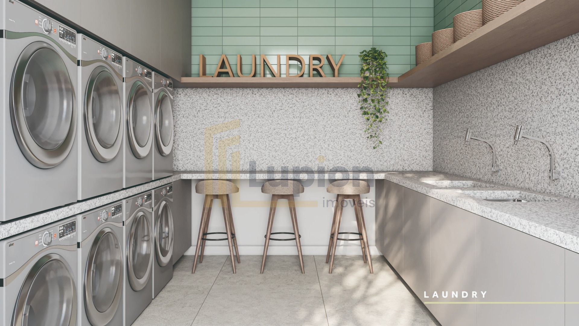 Lavanderia funcional, com espaço para máquina de lavar, tanque e armazenamento.