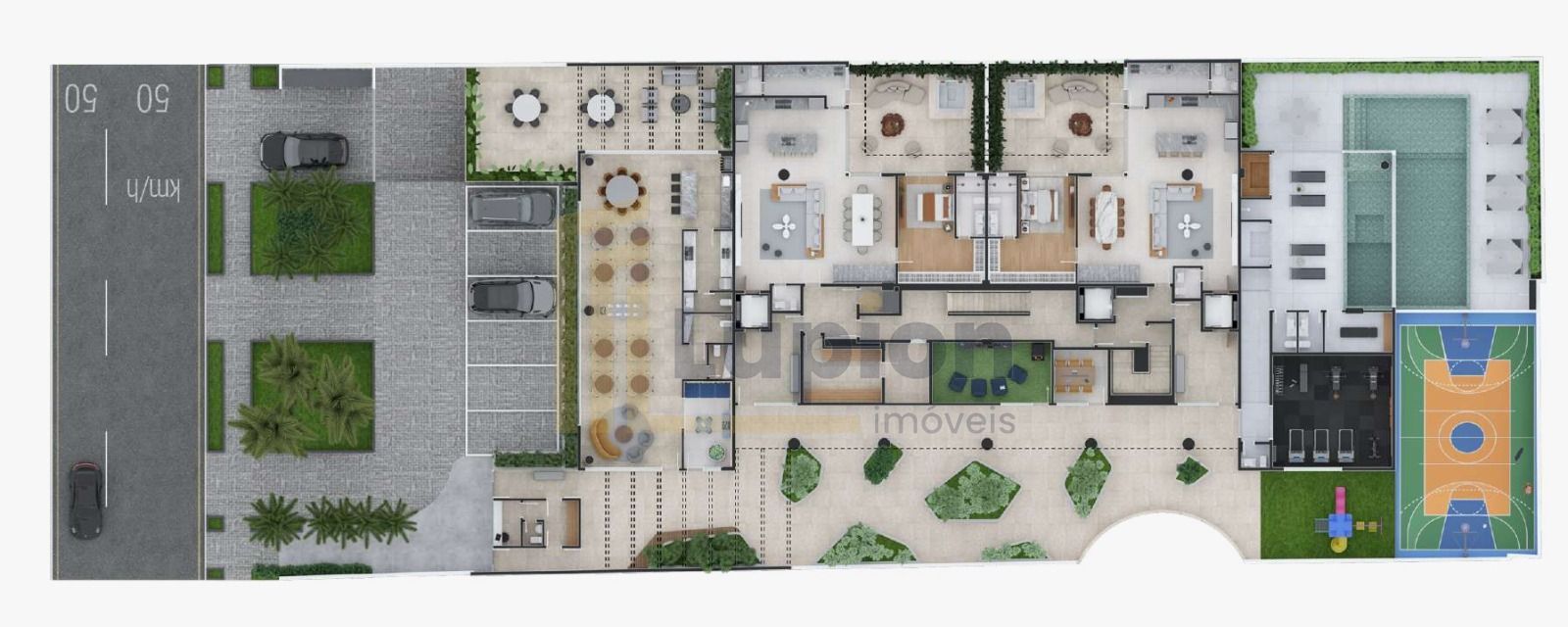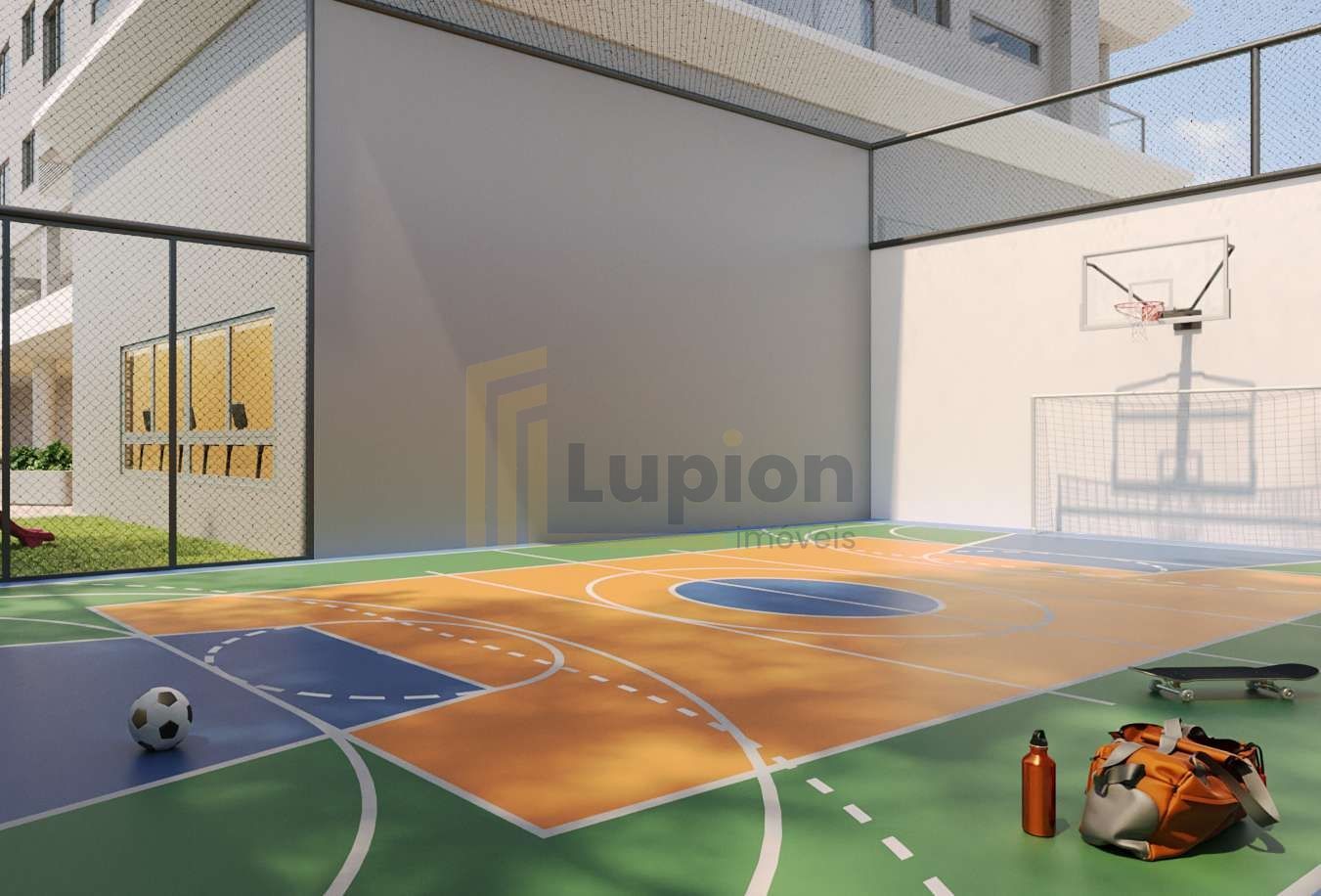 Academia equipada, quadra poliesportiva e playground para lazer e saúde.