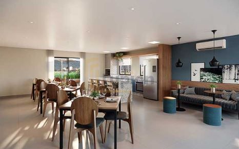 Apartamento no 11° andar com dois quartos, sendo uma suíte, sala de jantar e estar integradas, cozinha americana e varanda com churrasqueria.