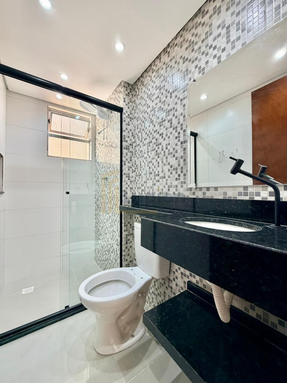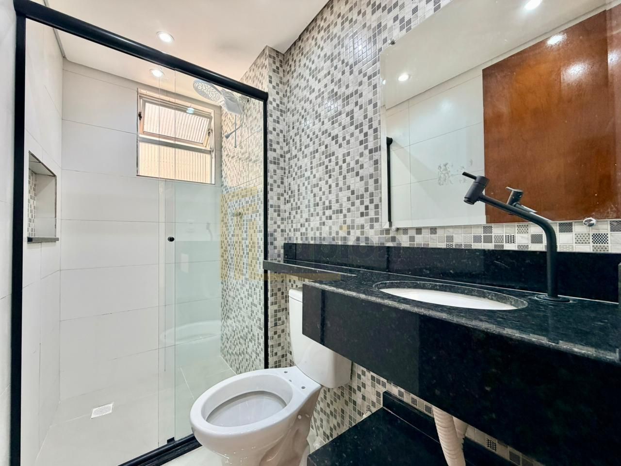 Banheiro social com box de vidro e nicho embutido;