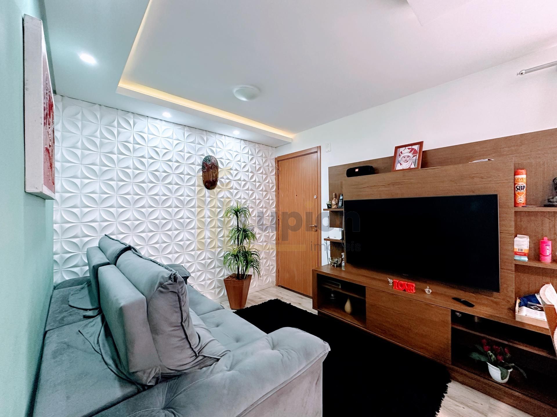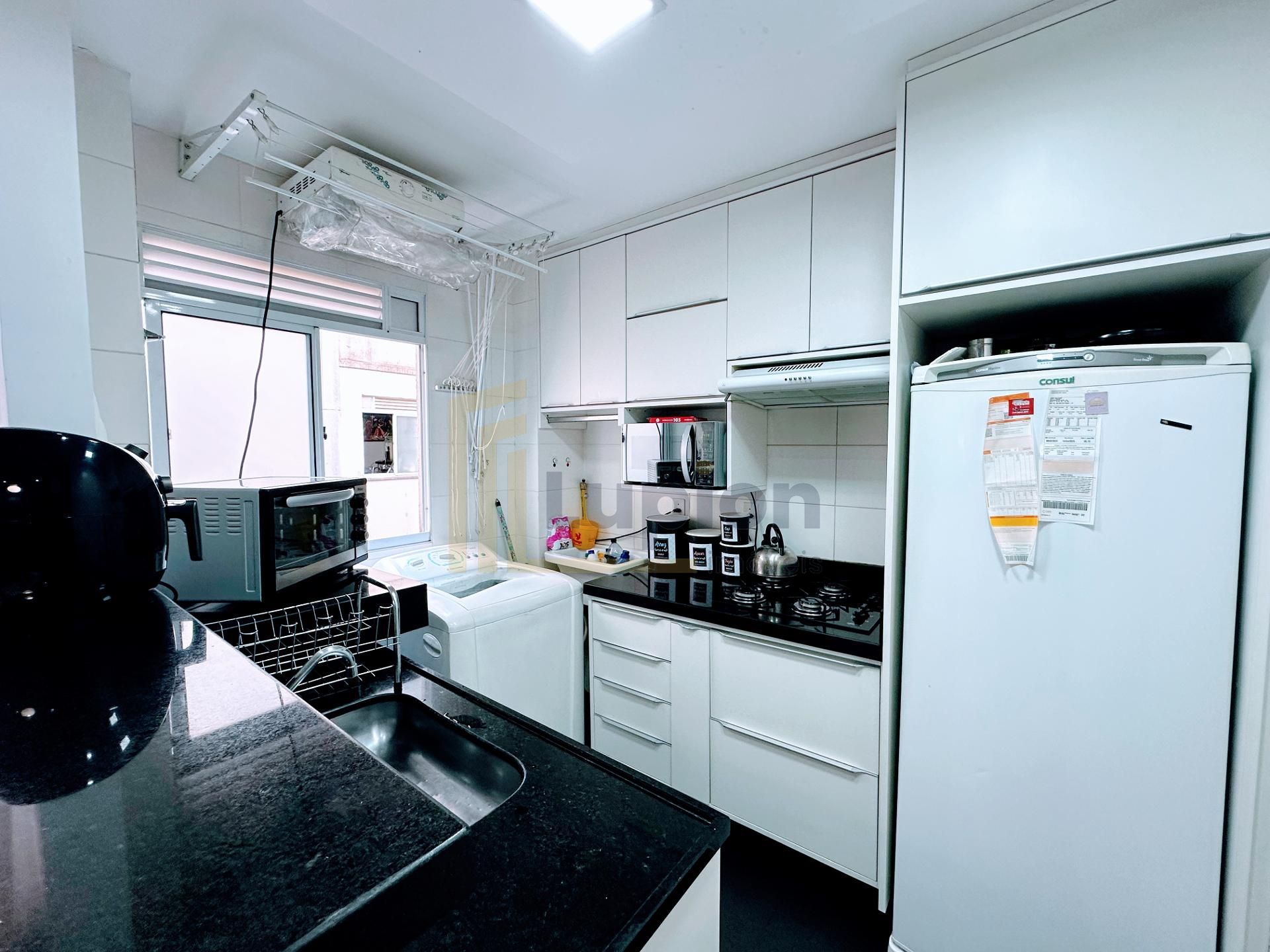 O Apartamento conta com aquecimento a gás na cozinha e banheiro, peitoril das janelas em mármore, piso de porcelanato preto na cozinha e banheiro, piso laminado na área social e quartos, cozinha com armários planejados, pia e bancada em granito, banheiro com armário e box de vidro, teto com rebaixamento em gesso com projeto luminitécnico na sala e cozinha, a sala de estar possui uma da paredes com placas em gesso. O apartamento conta ainda com as janelas dos quartos voltadas para uma das áreas verdes do condomínio, trazendo privacidade e tranquilidade para o seu novo Lar.