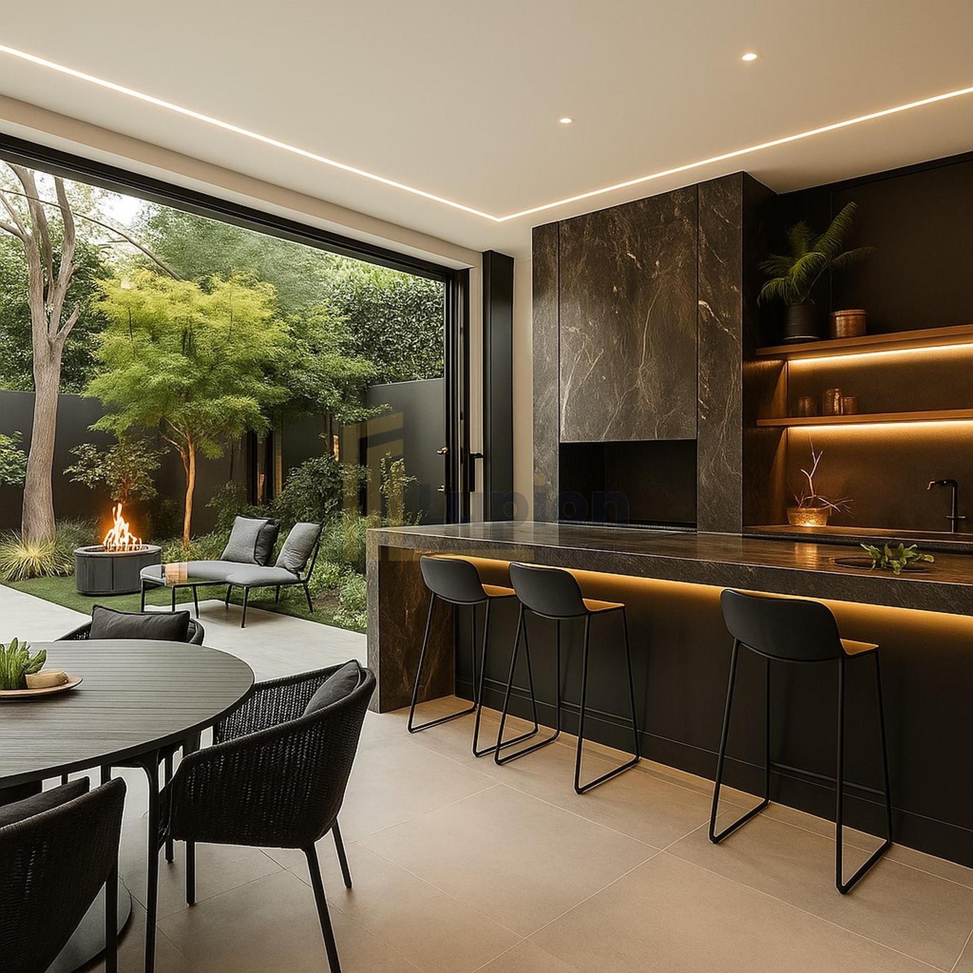 A linda lareira divide os ambientes dessa moderna casa que conta ainda com espaço gourmet externo com churrasqueira separada dos demais cômodos.