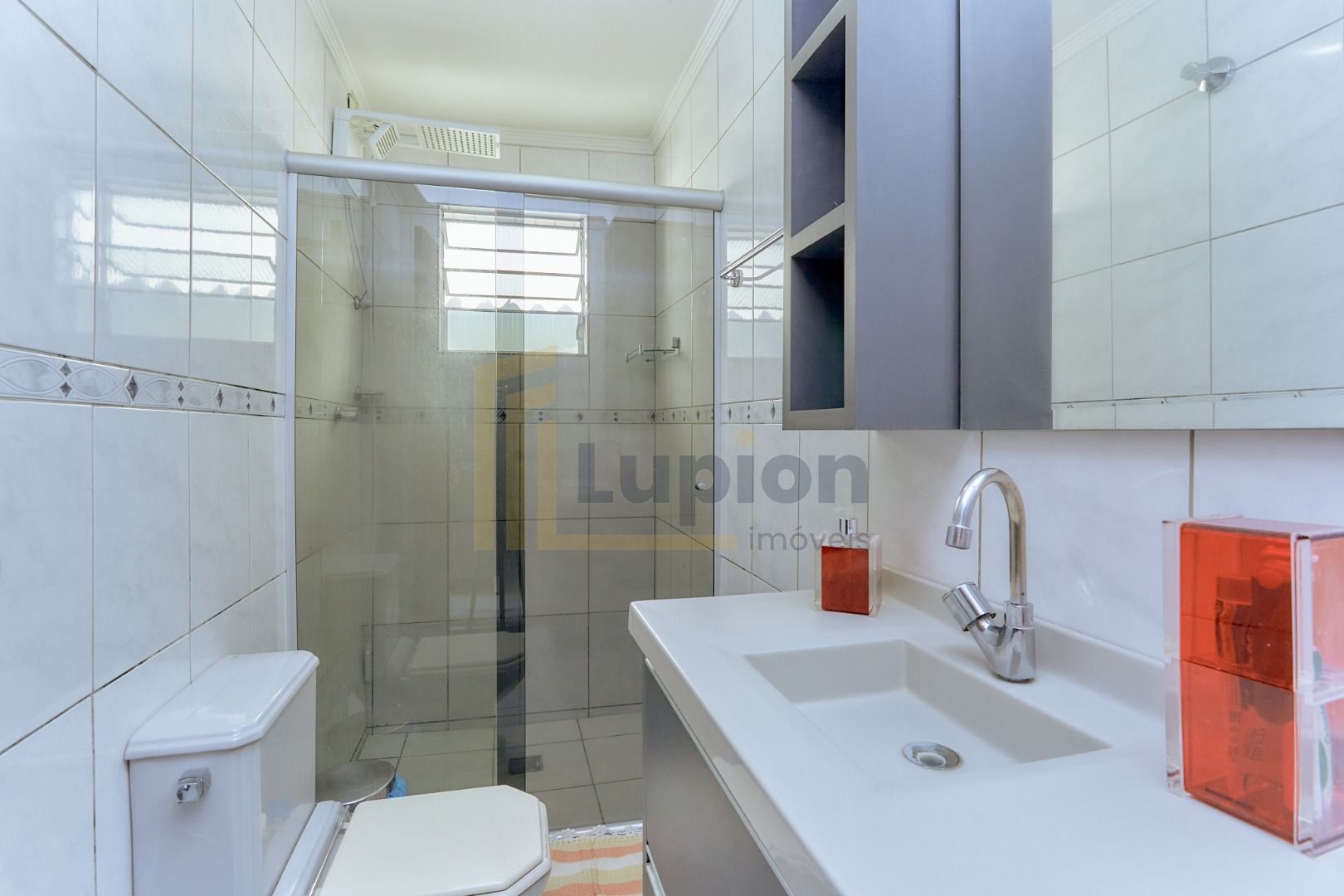 Banheiro social moderno: com box de vidro, pia com armário e acabamento de qualidade, combinando funcionalidade com estilo.