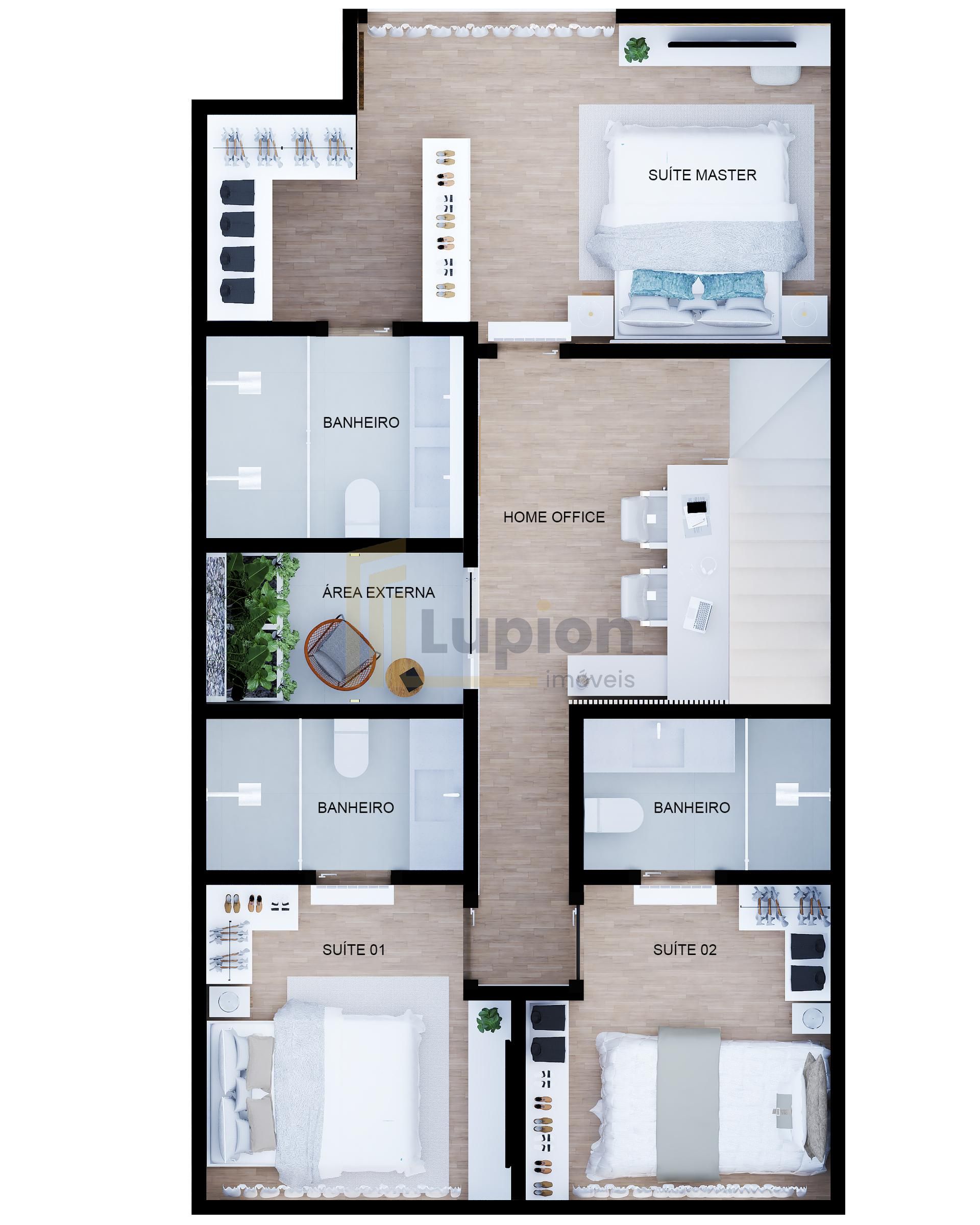 Segundo andar com 3 suites, sendo 1 suite master com closet. Todos com infra para ar condicionado, persianas automatizadas, piso aquecido nos banheiros