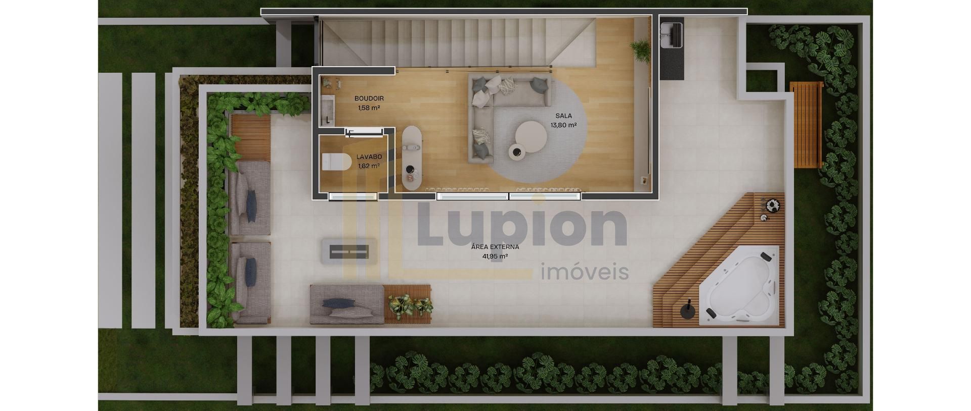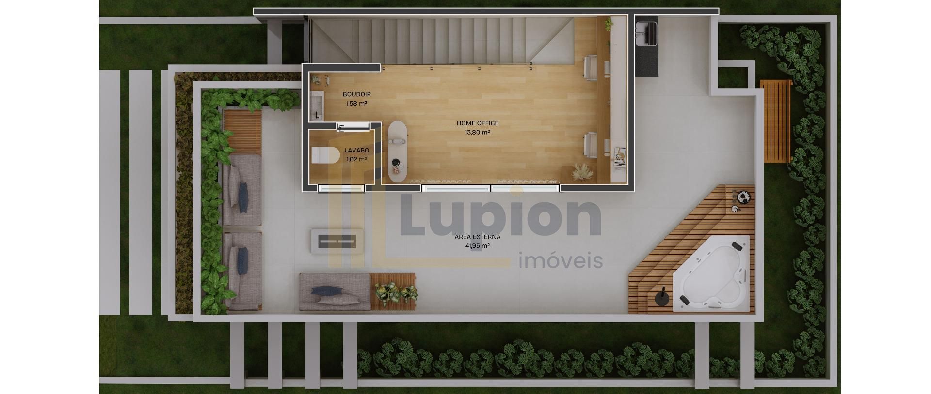 Espaço para home office ou estar intimo, lavabo com boudoir e ampla area descoberta com infra para Jacuzzi.