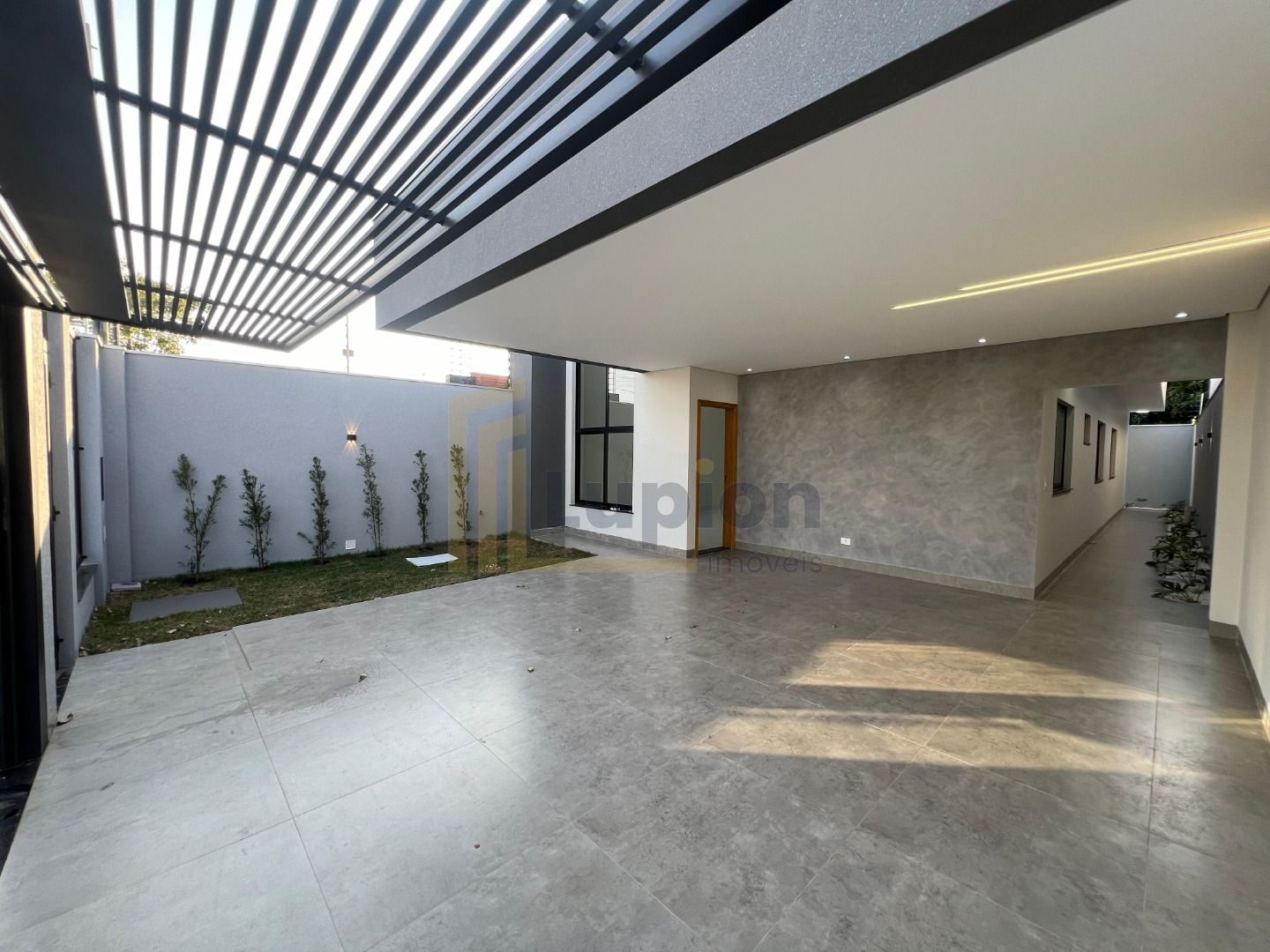 Garagem e área externa: Espaço planejado com iluminação moderna e funcionalidade para veículos e área de lazer.