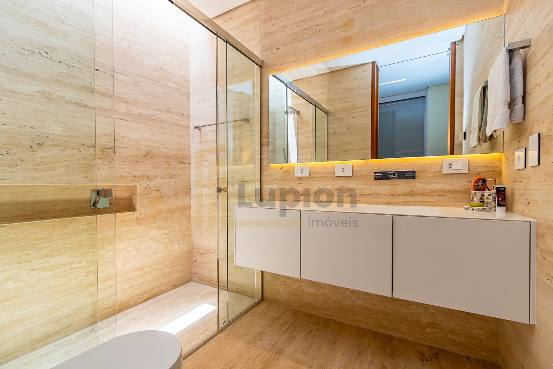 Travertino romano instalado em todo Piso, inclusive na garagem e banheiros, instalados pela ELF.