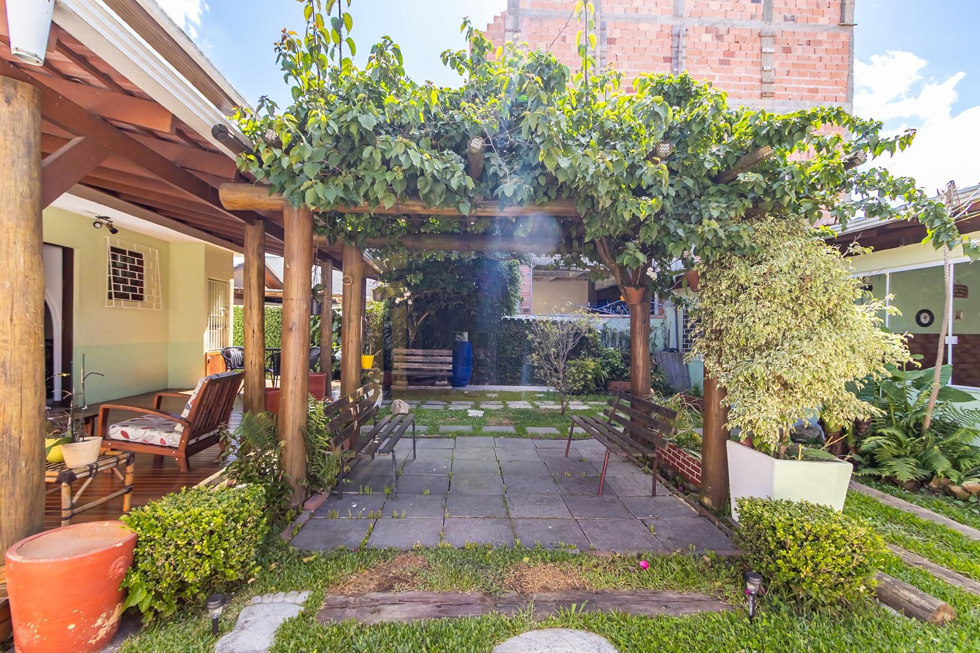 Quintal Exuberante: Destaque para a área externa, que conta com pergolado (*bougainville*), horta e diversas árvores frutíferas.