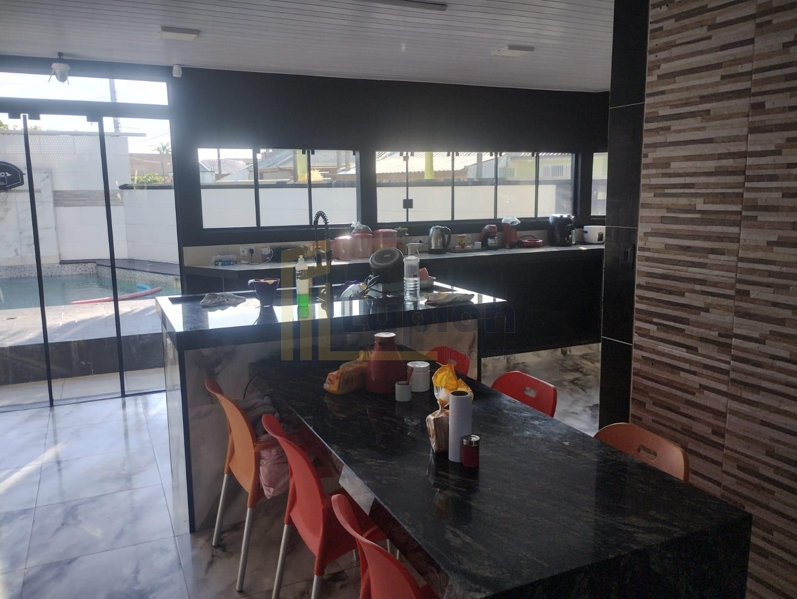Cozinha conceito aberto: totalmente em alvenaria, com portas de vidro, ilha central com bancada de granito integrada ao espaço gourmet.