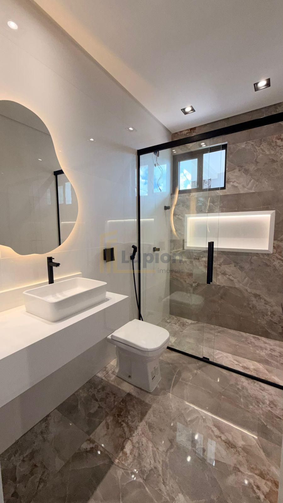 O banheiro da suíte possui pia esculpida em porcelanato, nicho iluminado em LED e box instalado, criando um espaço elegante e funcional.