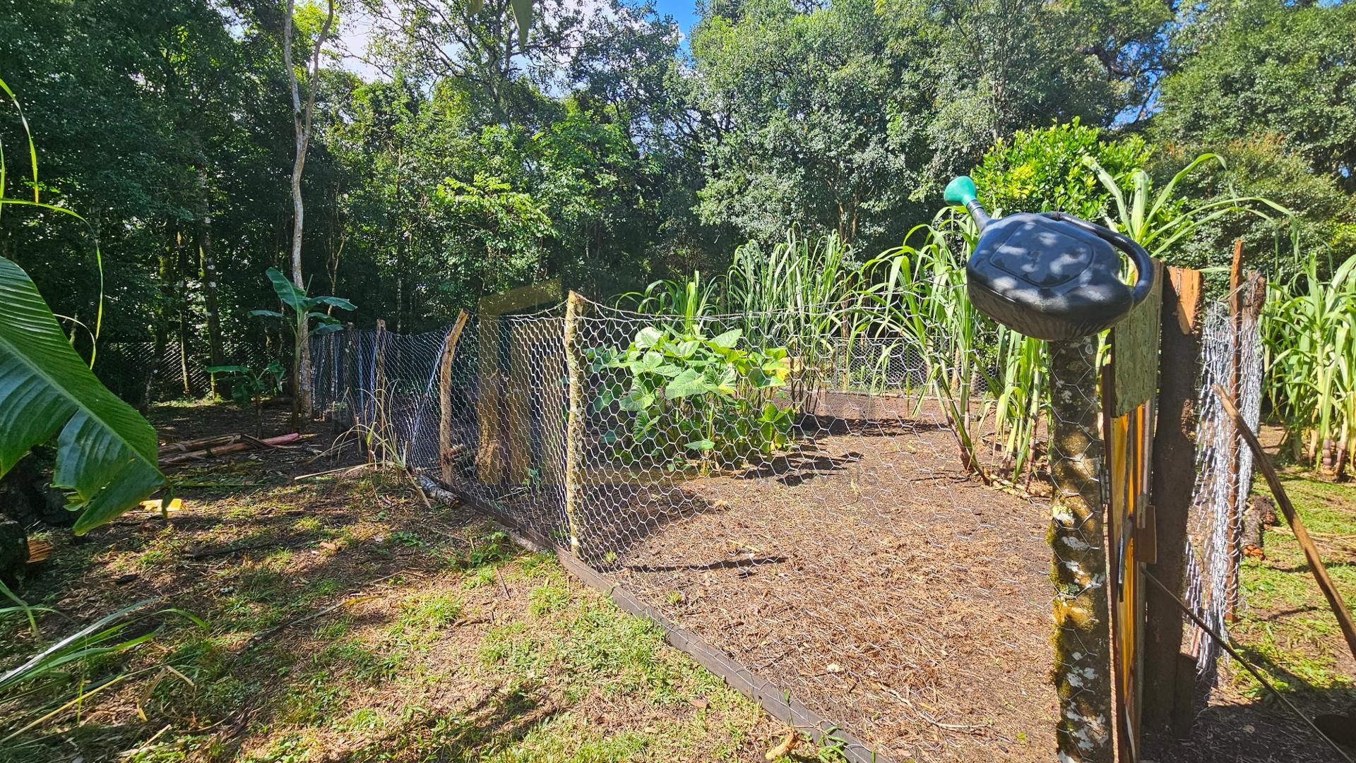 Formato retangular, 60% cercado com tela e o restante em processo de cercamento com arame, proporcionando segurança e controle do espaço