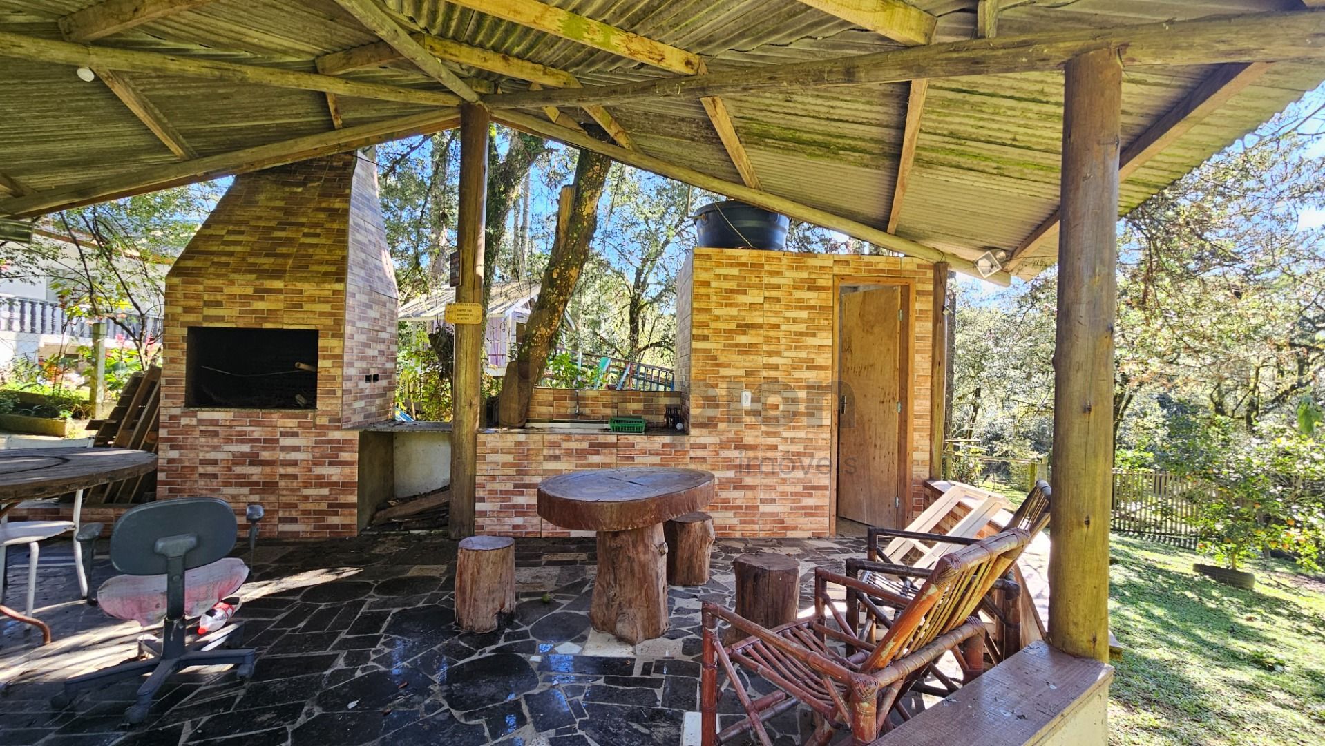Área externa completa: quiosque com churrasqueira, pia de apoio e lavabo