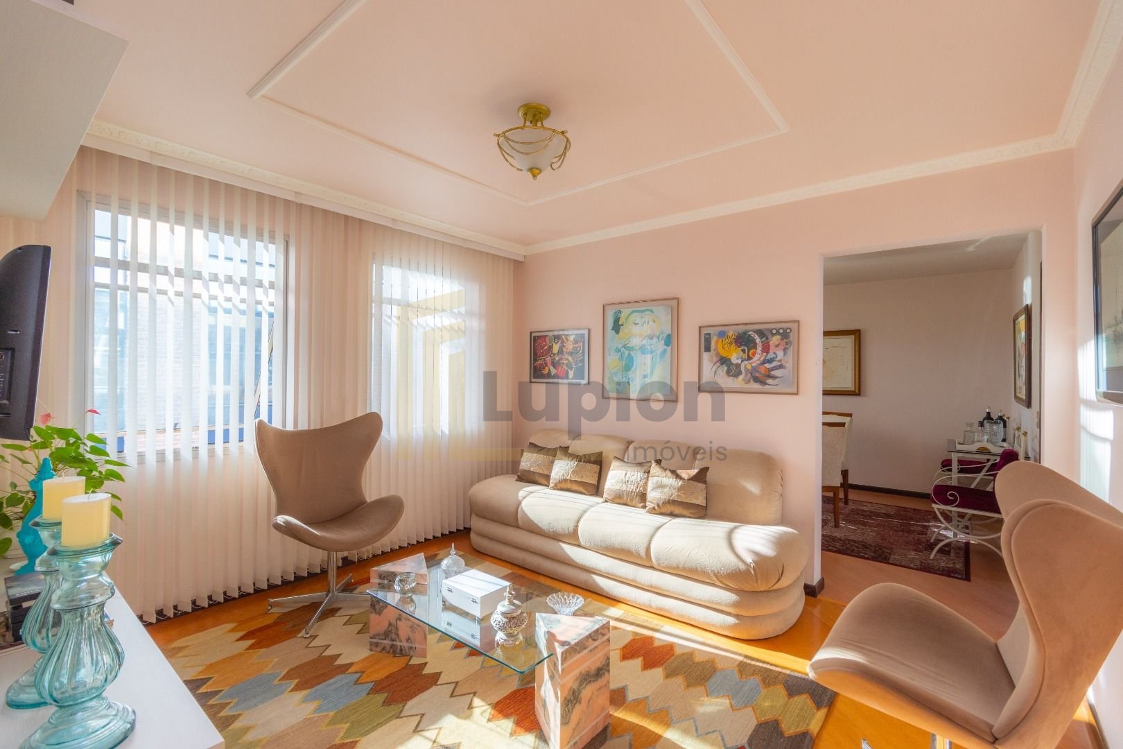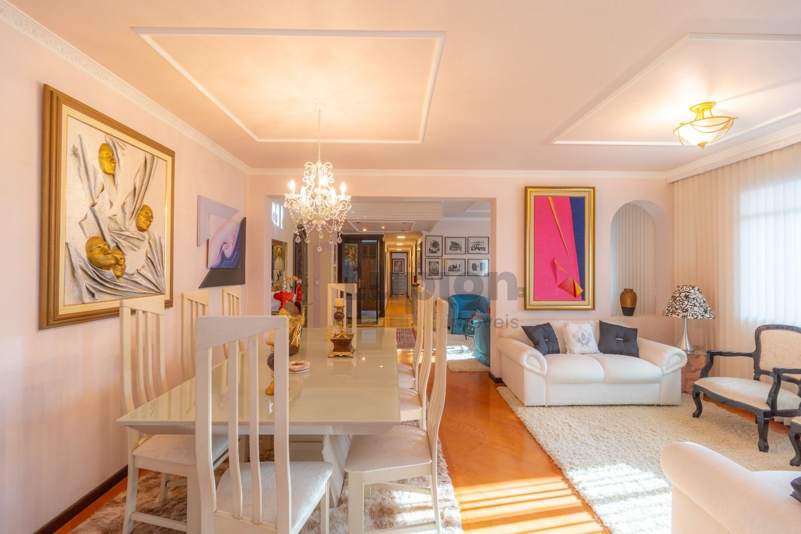 Quatro salas integradas: sala de estar, sala de TV, sala de jantar e copa ao lado da cozinha.