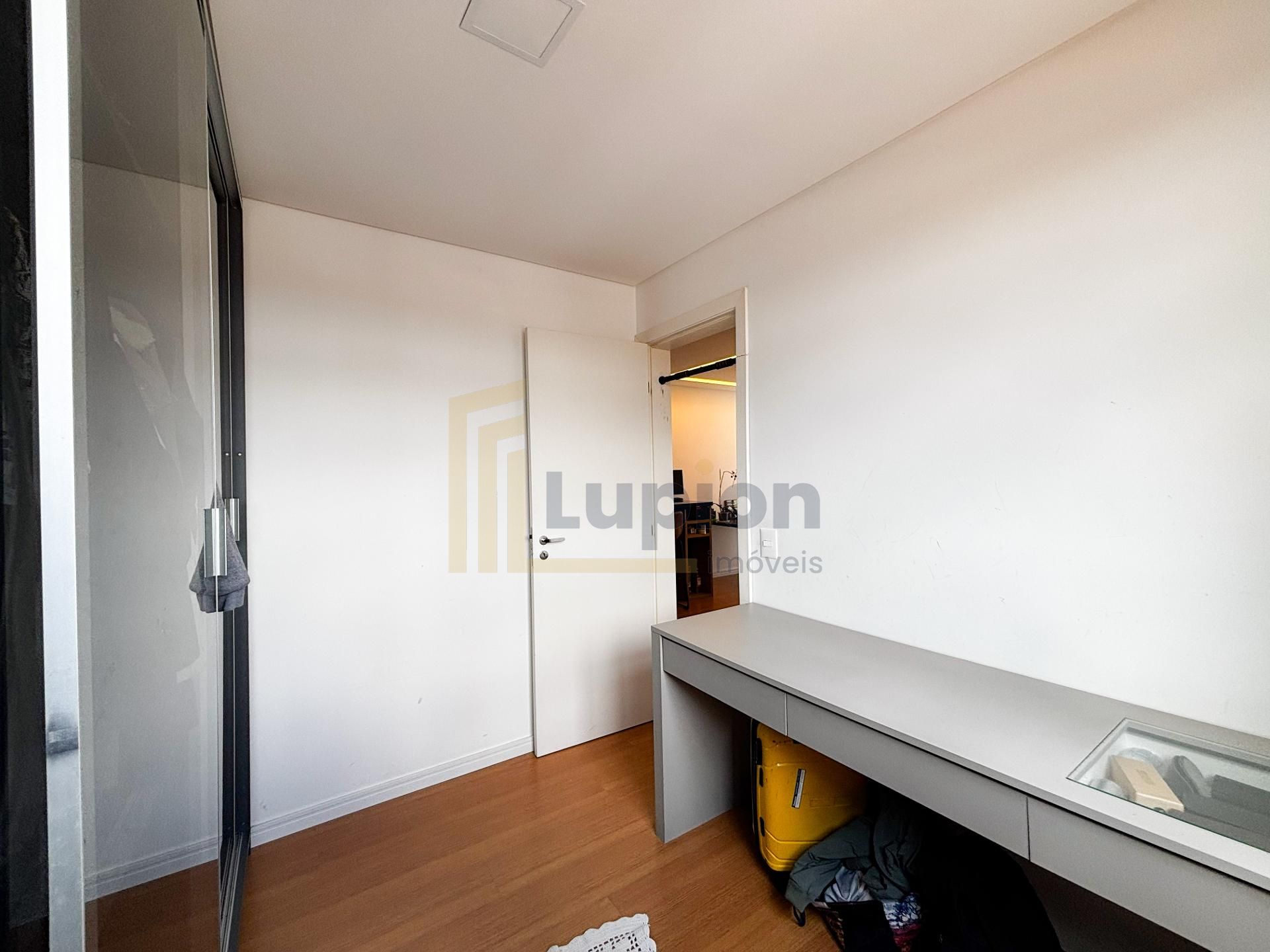 Quarto com closet planejado e escrivaninha integrada, ideal para home office ou penteadeira.