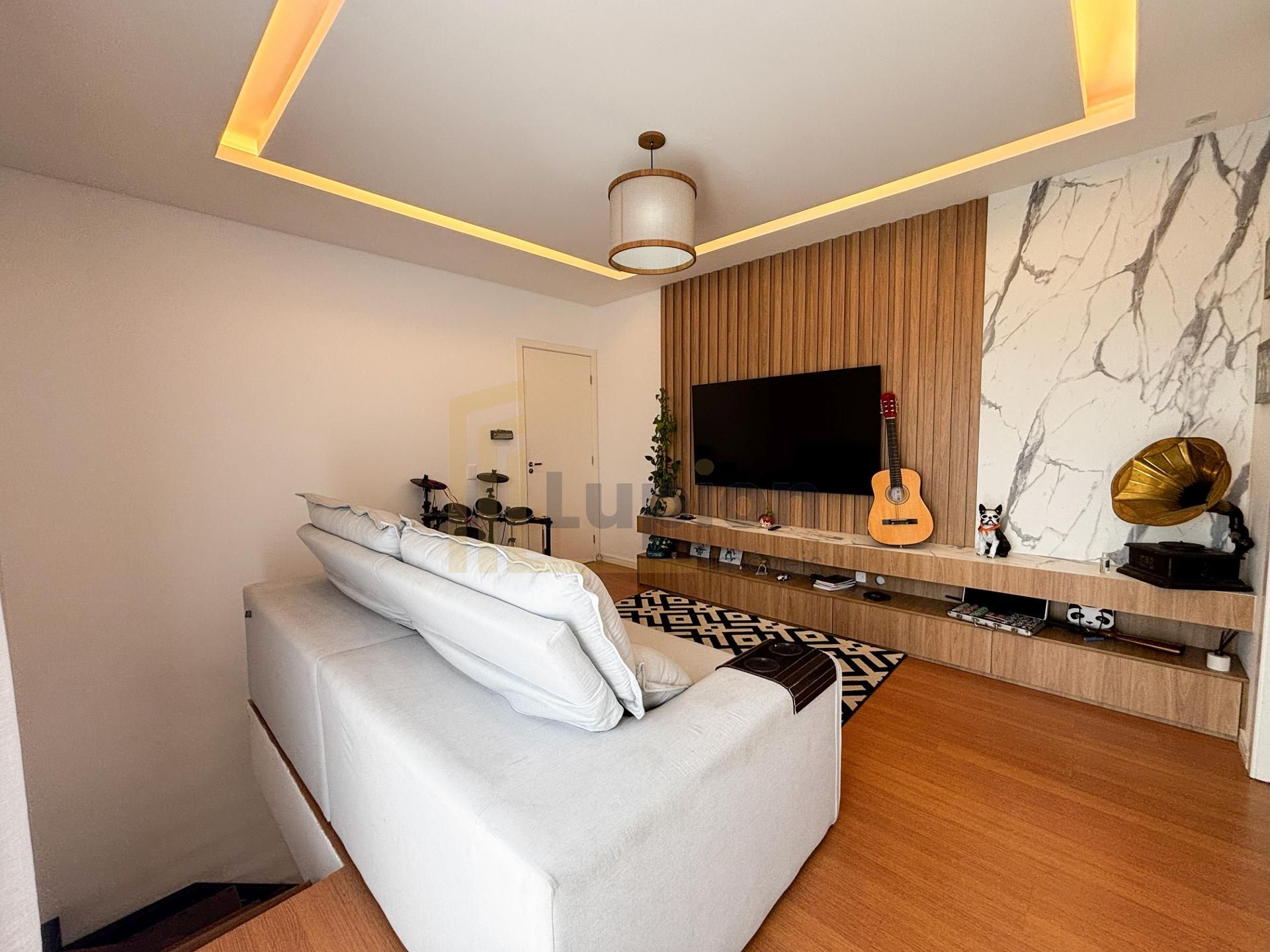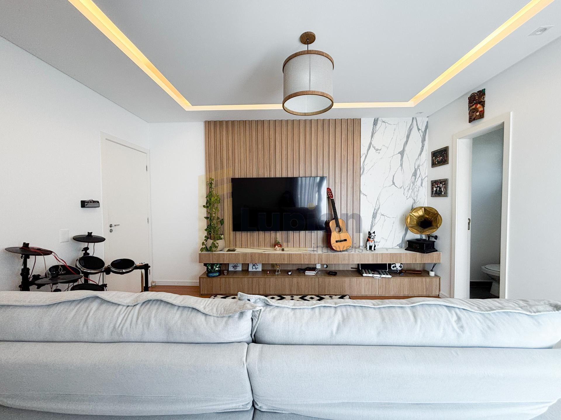 Sala de Estar Ambiente aconchegante com painel de televisão montado e papel de parede com efeito porcelanato.