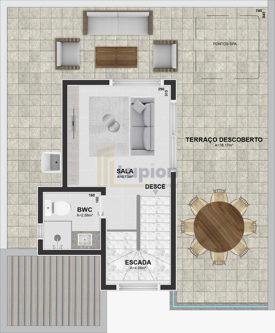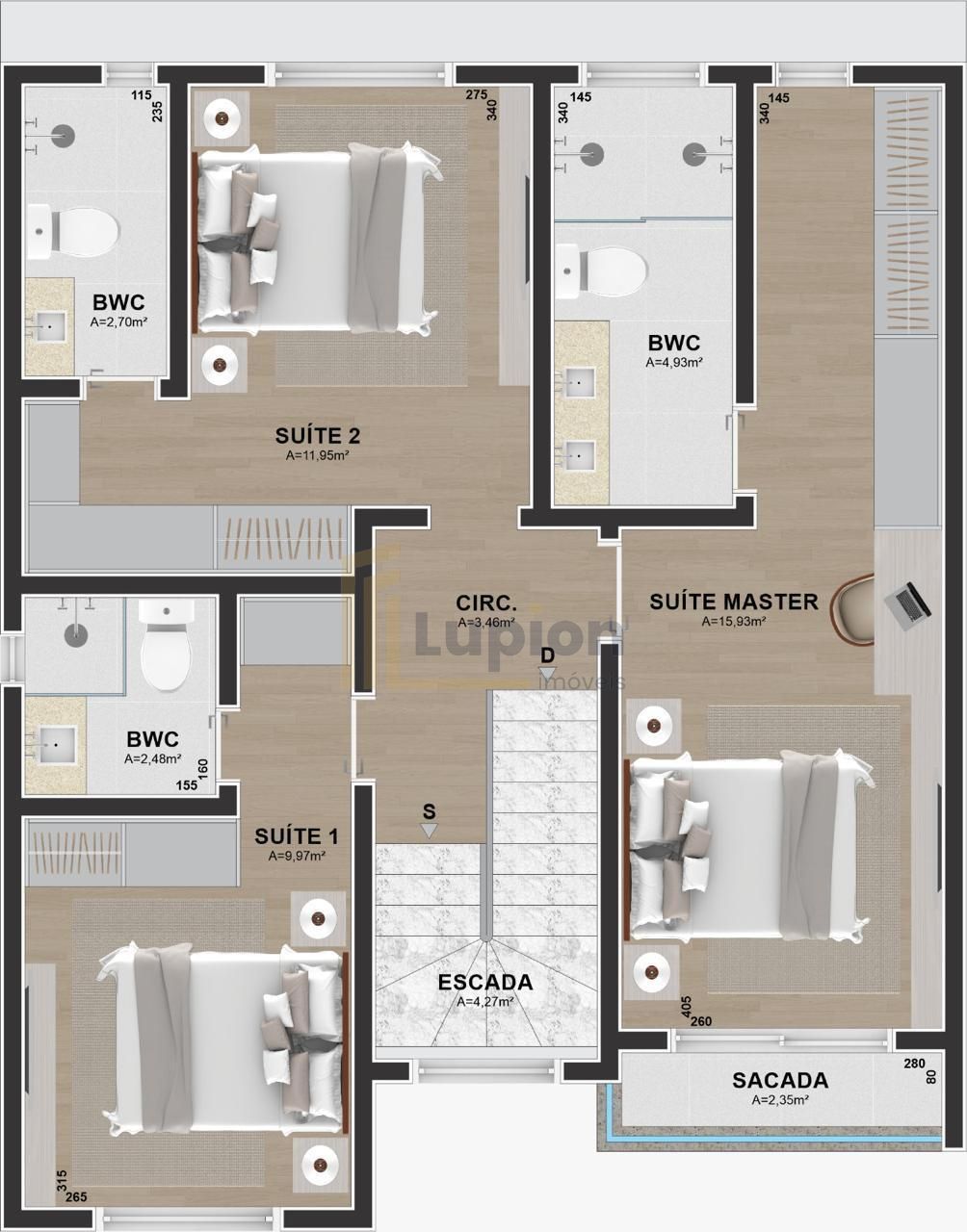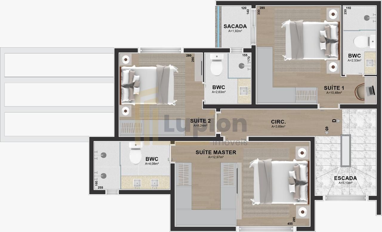 - Acabamentos premium com quartzo branco nas escadas