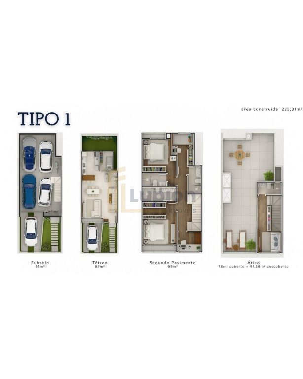 .O condomínio contem 3 tipos de plantas. Sobrados 1 a 4 com entrada privativa e garagem para 4 carros coberta.