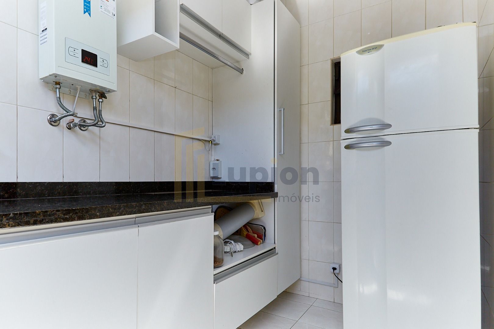 Cozinha com armários planejados e área de serviço bem ventilada.