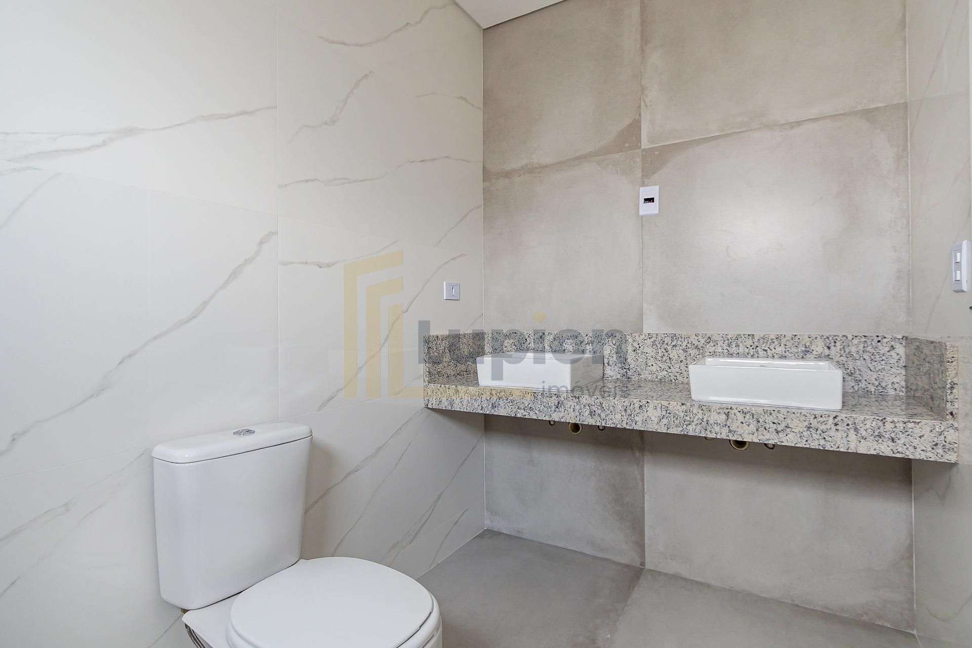 Banheiros modernos, lavabo no térreo e banheiros com cubas em mármore travertino, nichos e aquecimento a gás.