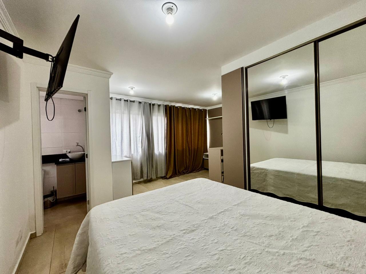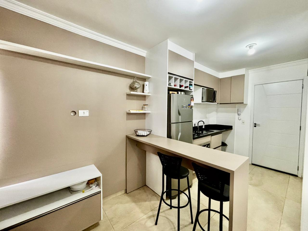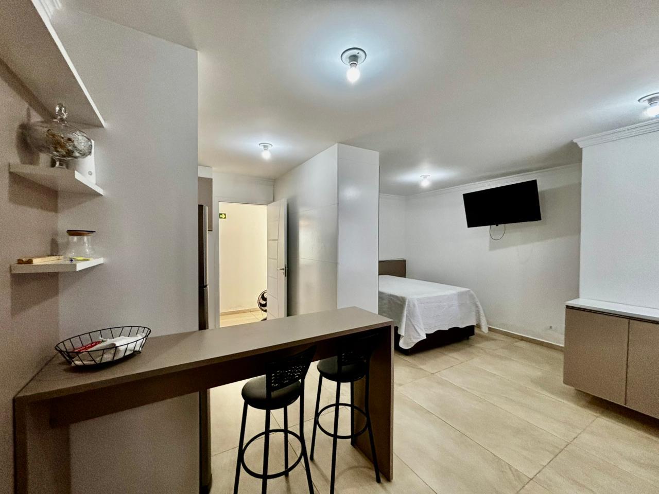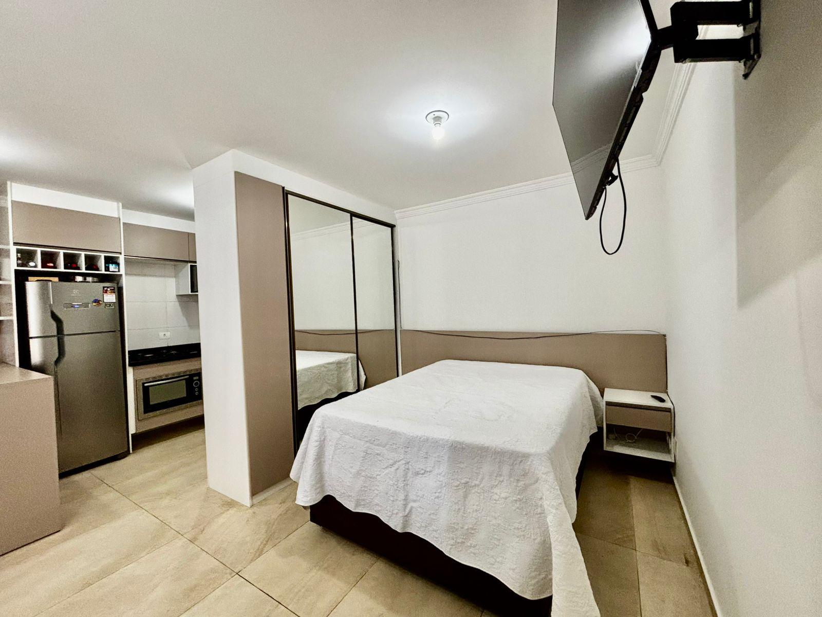 O imóvel conta com ambiente integrado de dormitório e sala, com excelente aproveitamento de espaço, armários planejados, painel com TV instalada e ótima iluminação natural, proporcionando conforto e praticidade no dia a dia.
