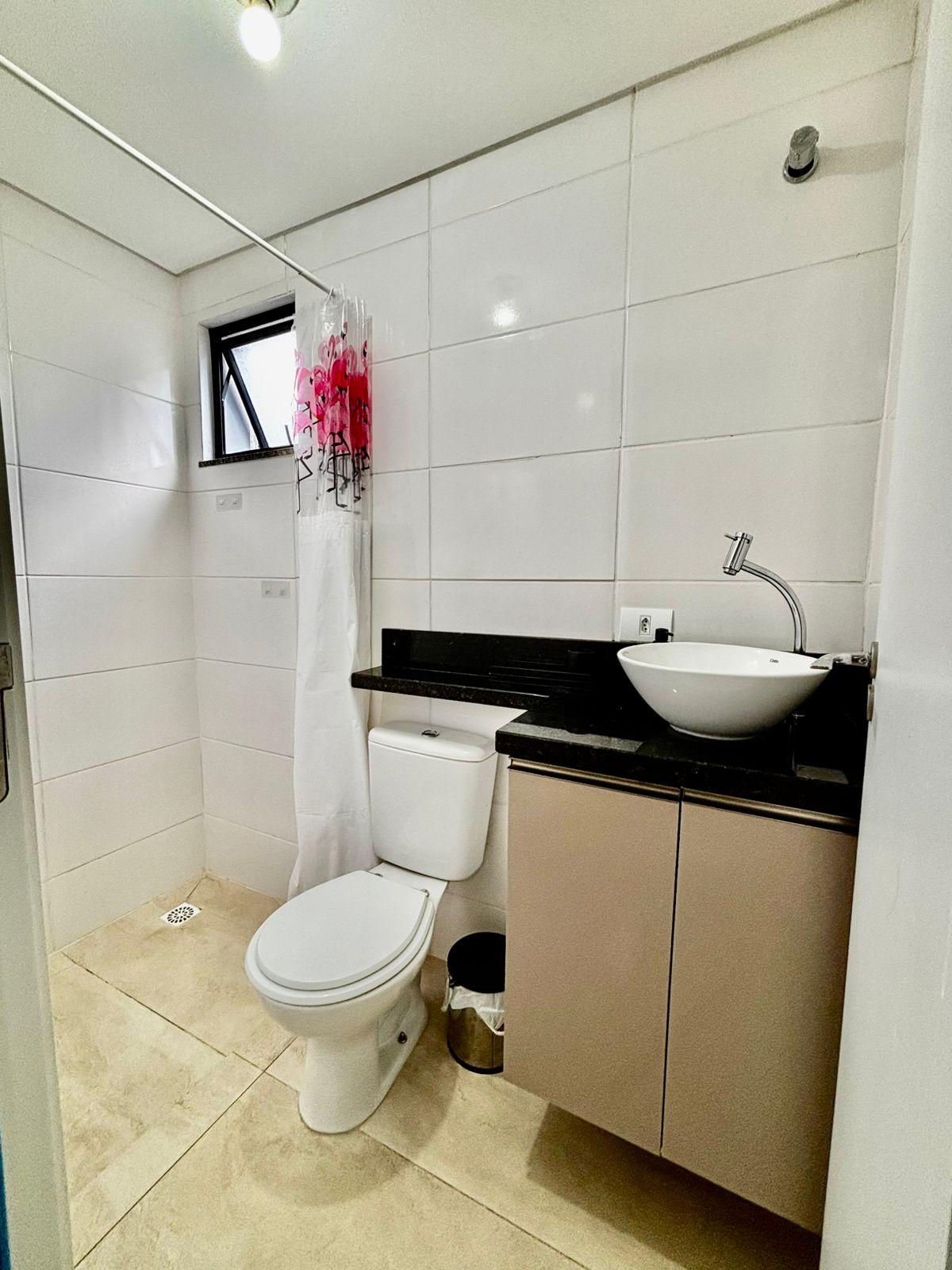 O banheiro apresenta ótimo padrão de acabamento, com bancada em granito, cuba sobreposta e armário planejado.